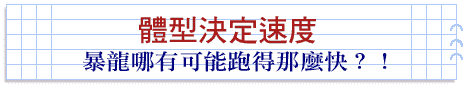 電影《侏儸紀公園》(Jurassic Park)中最令人印象深刻的,是那些栩栩如生各式各樣的恐龍,牠們或成群漫遊在草原上,如迅猛龍;或在廣大的沼澤窪地中蠕走,如雷龍;或者如暴龍,飛奔追逐吉普車,翻躍空襲劇中的小孩子們,尤其後者的兇猛噬血令人每回想起都不得不心有餘悸。但是你曾經想過暴龍飛奔的畫面有哪裡不對勁嗎?你平心靜氣仔細想想,你真有看過跑得很快、跳得很高的大胖子嗎?你仔細看看,奧運比賽的短跑健將中,有哪一個是體型很大的肥胖者?再仔細瞧瞧,那些場上的健將,哪一位腿上的肌肉不是結實飽滿的呢?暴龍的後腿雖然看似壯碩,但是與其六千多公斤的龐大身軀相比,實在是微不「足」道,牠跑得動嗎?牠可能飛奔且作出鳶子翻身的動作嗎?才怪!