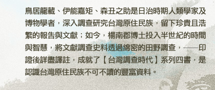 台灣史綜合研究的開創先輩中,東方人以連雅堂與伊能嘉矩最為著名。但論到援用近代科學知識,前者比起後者來,完全望塵莫及。伊能不僅詳熟漢籍文獻,博徵日、歐語文資料,更重要的,在萬卷書外,他還行萬里路,冒險勘查做成紀錄。伊能的業績已成為台灣史研究的範例。因此,楊南郡先生殫心竭力輯譯的本書,不只是研究原住民史的人應該看,研究台灣史其他範疇的學者專家也可以置於案頭參考。在此,我毋須特地讚美楊先生與伊能同樣是罕見的跋山涉水之研究實踐者,以及譯文之流暢,應該強調與推崇的是,書中之譯註與有關伊能生涯的資料整理,其貢獻絕不遜於學術界的正式論文。至少,我在研究荷蘭時代台灣史時,本書確實提供了相當多可貴的線索與資料。 —— 翁佳音 中央研究院台灣史研究所副研究員