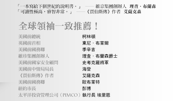 施密特與科恩,兩個人的知識背景截然不同,但都是這個時代最傑出的頭腦,他們對這個世界有很深入的觀察,對未來的走向極為關心,而且,他們都有改變這個世界的能力。《數位新時代》提供了一個少有的機會,讓讀者一窺將影響自己至深的未來。