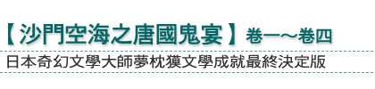 少有人知的是,以科幻、怪奇小說崛起日本文壇的夢枕獏,其實早在1987年前後,就已著手奇幻文學創作,這一部名為【沙門空海之唐國鬼宴】的作品,歷經17年的執筆連載,耗盡2600張以上的稿紙之後,終於在2004年出版,造成日本書市另一場「夢枕獏旋風」,許多人也方才恍然大悟,原來「安倍晴明」與「源博雅」的原型,早在「空海」跟「橘逸勢」身上,早就可以看到端倪了。無怪乎夢枕獏要說,【沙門空海之唐國鬼宴】是對他具有特別意義的一部作品了。