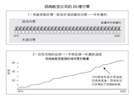 乍看之下,你或許不覺得西南航空有什麼特別。但想想看,這家航空公司為自己樹立了一致的績效標準,達到其他航空公司都達不到的穩定績效!如果有任何人敢大言不慚地說,他們在航空業可以連續三十年,年年都賺錢——航空業耶!——必定惹來一陣嘲笑,因為沒有人辦得到。但是西南航空公司卻辦到了。而且他們不惜放棄高成長。想想看,有多少上市公司的領導人能夠放棄追求高成長?尤其在景氣大好、競爭對手都拚命追求高成長的時候?的確寥寥無幾。但是西南航空也辦到了。