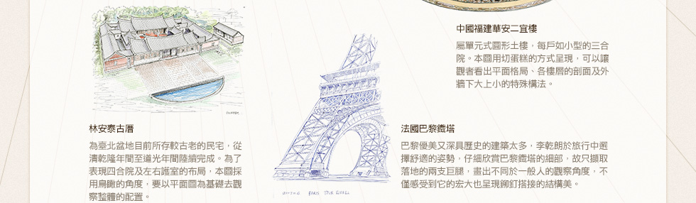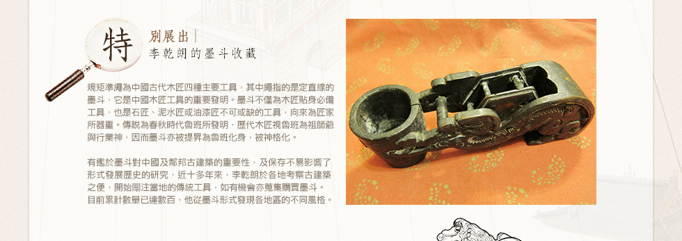 古建築偵探李乾朗開展 解剖建築超視野 (2012-10-06)一座近三米高的巨大仿製台北城北門,北門的牆上置有各種互動式的設計,今日(10/6)出現在臺北市中山堂二樓的展示廳裡,醒目的裝置吸引不少民眾駐足觀賞。這件仿製品是特別為「古建築偵探的奇幻旅程:李乾朗建築手稿暨收藏展」所設計之展示平台之一,在光輝的十月裡將帶領觀眾跟著李乾朗來一趟古建築的奇幻旅程。