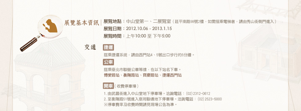 中山堂公告:11月1日起,每日上午11點、下午2點兩時段,前10名完成參觀並在第二展覽室服務台留言者,免費贈送展覽手冊。手冊收錄展覽完整內容,以及李乾朗老師精采手繪圖,值得珍藏!每人限索1本,數量有限,送完為止。 (2012-10-29)