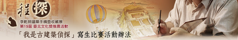 為彰顯第15屆文化獎得主李乾朗教授精於古建築研究、專注古建築美學之傳播及推廣古蹟教育長達40年之貢獻,特辦理本寫生比賽。邀請全台有興趣的國高中學生及成人參與,以舉辦地點之古蹟中山堂及剝皮寮為繪畫對象,鼓勵效法李教授自青少年起即觀察並繪製古蹟的創作精神,並提昇藝文風氣,推動市民正當休閒活動。