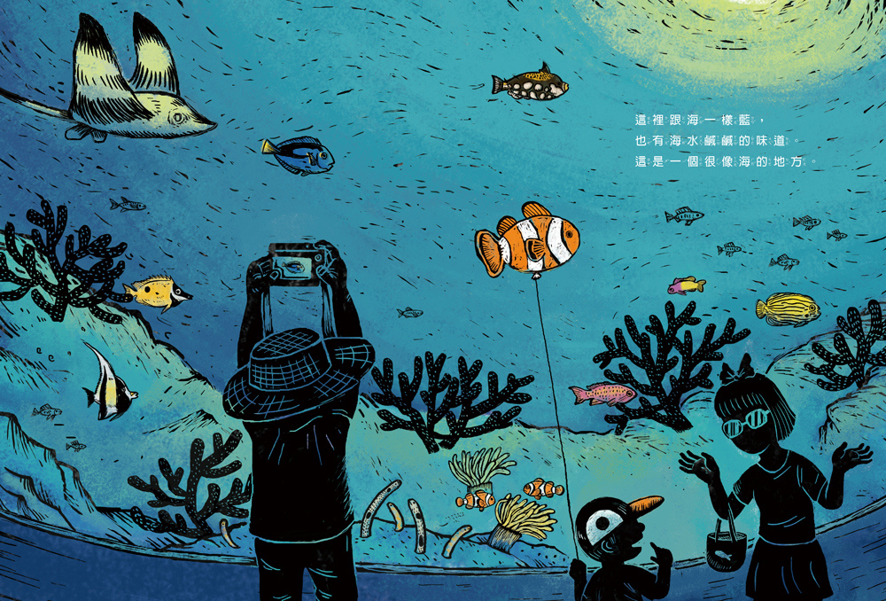 細讀全書看似描述小男孩心情的第一人稱敘述,會發現它也巧妙呼應了在這個「像海的地方」中海洋生物們的遭遇;林柏廷以「一語雙關」的文本,搭配帶有強烈版畫風格的視覺趣味,創作出這本能帶給小讀者深刻經歷的獨特作品。