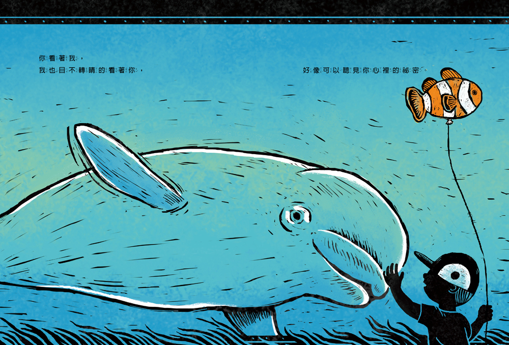 ◆獨特的視覺表現:以類版畫風格的細膩繪圖,營造出光影、明暗對比強烈的藍色水世界。 小男孩跟爸爸、媽媽一起到了一個「很像海的地方」,這裡,有著形形色色的海洋生物。手拿小丑魚氣球的他,也許是和小白鯨「交換祕密」時太專心了,竟和爸媽走散了……。隻身行走在全然陌生的地方、穿越擁擠的人群,讓小男孩不時感到緊張、不安與害怕……,懷抱著這樣心情的他,看著一一交會而過的動物們──小至水母、海星,大至海豹、鯨鯊等,彷彿也懂了牠們的處境與感受……