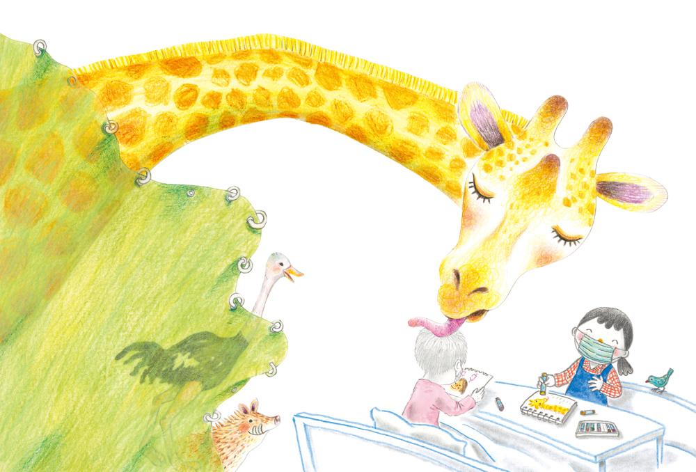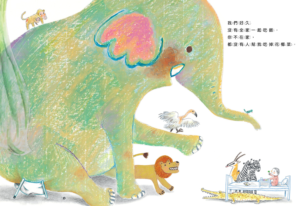 在蠟筆的飽滿色彩,與鉛筆、壓克力的淡淡勾勒中,一幅幅溫暖童稚卻又逼近真實的畫面,帶我們去細細感受這個觸動生命核心的故事……