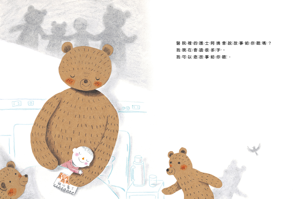 一本以愛的能量灌注,可以讓孩子在不同年齡一再重讀的繪本! 全書從一位小姊姊的視角,描述對生病住院弟弟的關心和想念,以及姊弟分離的孤單與失落。在姊姊充滿親情召喚的娓娓敘述中,在懷抱著全家「一起去動物園」的期待與希望中,各種動物朋友接續出現在弟弟的病房裡──有高個兒長頸鹿的輕輕舔舐,小狐狸與兔子的細心照拂,大象、斑馬、鱷魚、瞪羚、獅子……組成的熱鬧共餐隊伍,企鵝也來澡盆一起戲水,小熊一家的幸福故事時間……,即使夜深了,也有貓頭鷹、蝙蝠、浣熊……等夜行性動物來陪伴守護;更有一隻小小的青鳥始終靜靜看顧著弟弟……