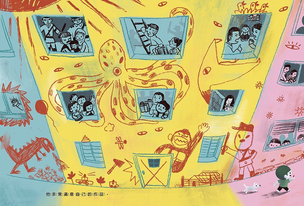 兩個男孩間非常具象的爭執(和之後面對後果的舉動),讓小讀者很容易同理並共鳴,但對應於文本的淺顯和簡約,圖像卻自扉頁(仿遠古壁畫)起,就透過各種牆面塗鴉和一個又一個的窗景,構築出或是過往歷史(例如二戰猶太受難、柏林圍牆),或是當代生活(例如兒童教育、貧富差距、蒙蔽vs正視、禁錮vs自由)的許多「片段」……,讓讀者在不斷挖掘圖像訊息的閱讀過程中去思考:如果握著畫筆的是我們,那我們想畫出什麼樣的世界?面對這個衝突/戰爭頻仍的世界,我們可以如何理解、對話、關懷並行動呢?