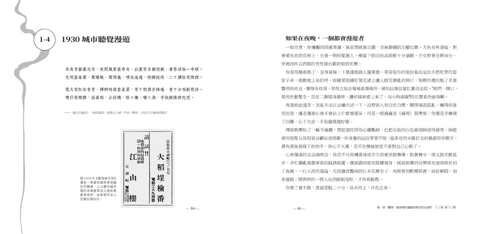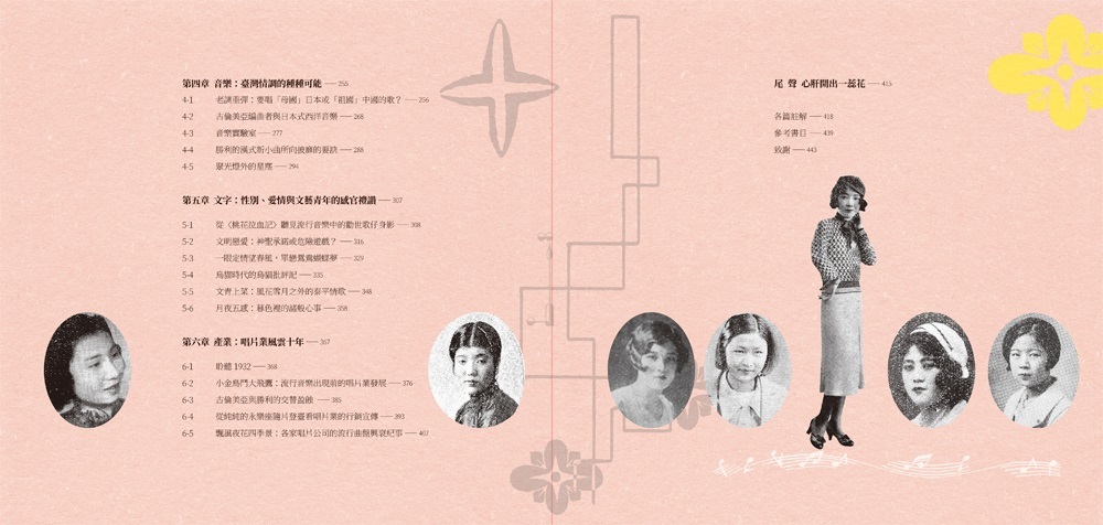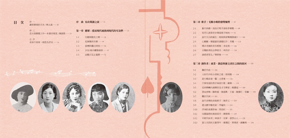 全書分成:聽眾、歌手、創作者、音樂、文字、產業等六大章,從多角度、全面性地探討臺灣流行歌萌芽至興盛的第一個黃金十年;隨書並附一精心製作、收錄21首代表性戰前臺灣流行音樂的復刻典藏CD專輯,讓閱讀此書的讀者同時也能親耳聆賞那遺落的時代之聲。