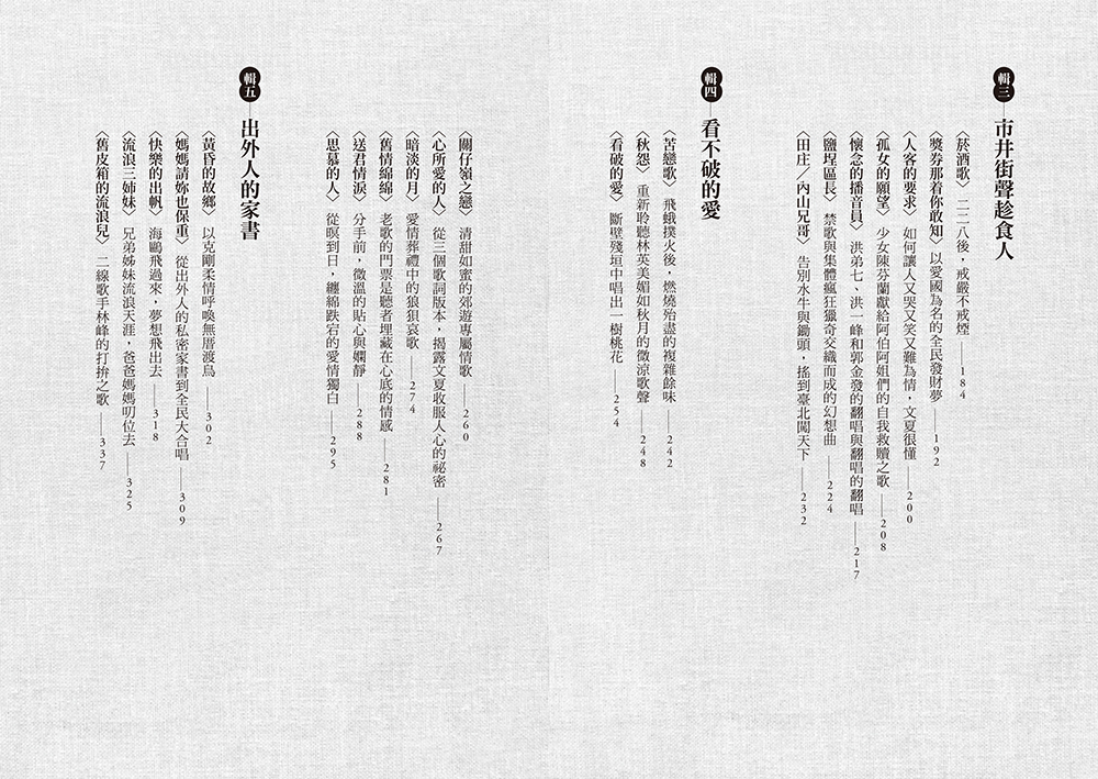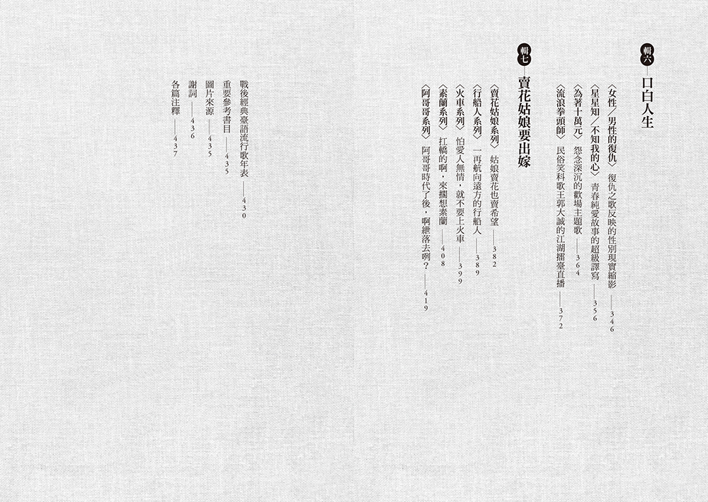 全書七章,以近五十篇文章,細剖精描百多首經典臺語歌曲。前二章討論戰後至本土黑膠唱片開始量產的一九五七年間,音樂創作人與歌手的努力與心血;第三至第七章則分別以市井街聲、情歌、懷鄉曲、口白歌、主題系列等方向,探討一九五七至一九六九年間,戰後臺灣流行歌最豐富生動的五大子題。
