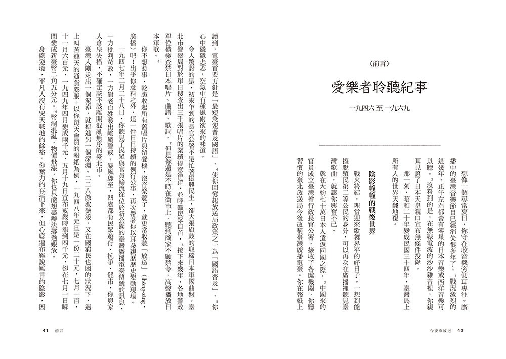 只是,我沒想到這麼快,芳怡就寫出這本《今夜來放送:那些不該被遺忘的臺語流行歌、音樂人與時代》!文字更見熟練,情感收放更自如。寫音樂,很不容易,一不小心,就陷入技術術語的迷宮,或是讓讀者有隔靴搔癢之感,光讀文字,未聽音樂,往往不知所云。但芳怡能寫到讀者即使不聽音樂,文字也能自成一格,提供相當完整的閱讀經驗;如果已經聽過音樂、或是邊讀邊聽,更會訝異於芳怡用字之精準、見解之深刻,顯然是潛心多時的積累之作。