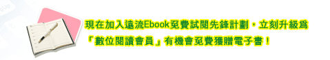 由於您是遠流博識網的會員,所以能夠優先參加「遠流Ebook免費試閱先鋒計劃」,不但能立即體驗數位閱讀全新感受----金鼎獎最佳電子書《老鼠娶新娘》免費試閱;還能升級成為「數位閱讀會員」,優先享有試閱電子書的權利,並有機會免費獲贈遠流電子書!我們希望透過此一試閱先鋒計劃,讓所有會員參與電子書研發與改善的意見回饋,讓遠流電子書精益求精,達到更高品質。