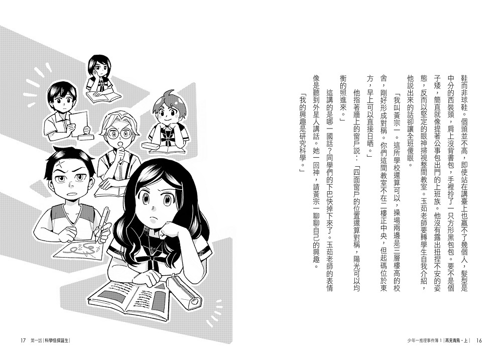 《少年一推理事件簿》結合推理、科學、青少年成長故事三大元素,搭配大量圖片,形成獨特的閱讀經驗,讓讀者能在動腦推理的刺激中,連帶體悟科學精神、學習科學知識,並跟著故事裡的角色成長。