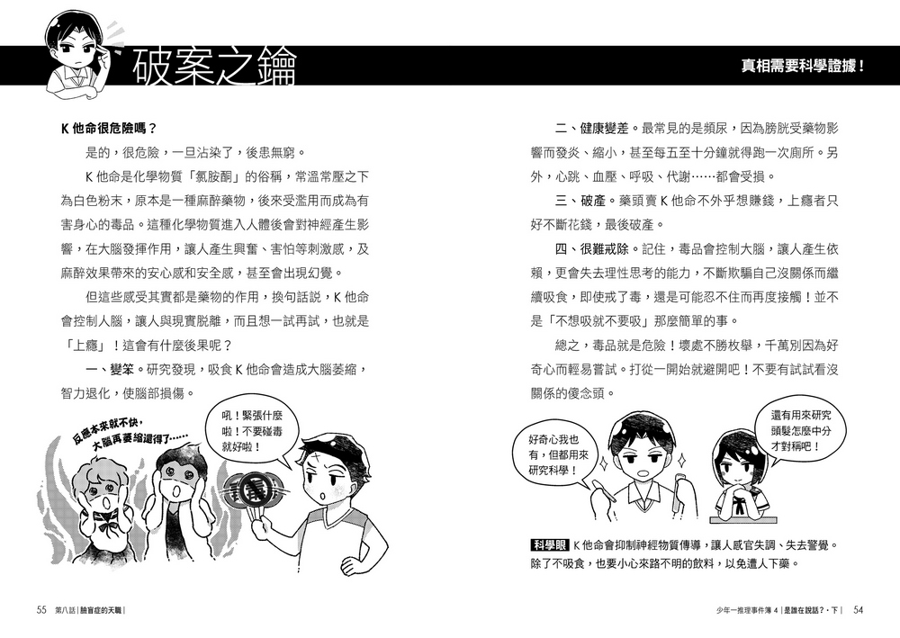 每單元最後有獨立的科學知識專欄,說明破案要點,或對原本的推理提出挑戰,讓本系列書籍不僅是好看的小說,更兼具學習功能。