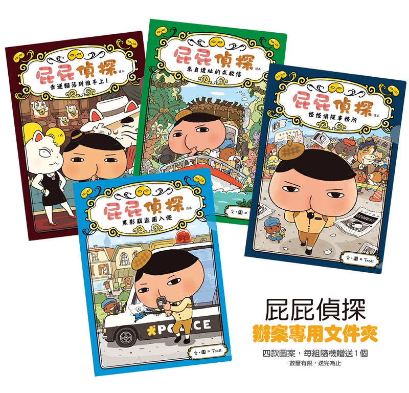 ★限量加贈「屁屁偵探辦案專用文件夾」,共4款圖案:「黑影竊盜團入侵」、「來自遺址的求救信」、「怪怪偵探事務所」、「幸運貓落到誰手上」。每個文件夾為單層L型、聚丙烯(PP)材質、五色彩印、尺寸220*310*0.18mm、輕便好用、可供收納標準A4各式文件,讓你像屁屁偵探一樣,不會遺漏任何重要資訊。每套組隨機贈送1個,數量有限,送完為止。