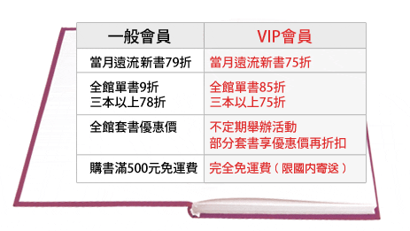 現在,遠流博識網首度募集VIP,除了購書優惠的承諾外,在遠流不斷創新的閱讀服務上,VIP會員將能優先參與,享有購書以外更多的閱讀價值。只要您當年度消費總額累計滿2,000元,10天後就能升等為VIP會員,享有一年的VIP會員資格;只要在此資格一年內的消費超過2,000元即可延續至下一年度。