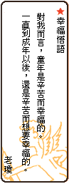 ¡@¡@¤p®ÉÔ®aùØÀô¹Ò¤£¦n¡A§Ú¤»·³´Nn§¤¤½¨®¥Xªù¥h§å¦^¤½¨®²¼¨Ó½æ¡A¤@Ó¤H¨Ó¦^¤]¨S¦³¤°»ò¦M¾÷·NÃÑ¡F¹J¨ì»ä·¤Ñ¡A®a¤¤¤H´Nn¥´´²¨ì¦U®a¥h¸ú«Îº|¡Aªù«e¤@¦Vº}«Gªº·x¦¿ªe¡A»ä·¹L«á´N¯B¤F³\¦h®a·´«áªºÁç¸J¿]¬Ö¡A¬Æ¦Ü«ÍÅé¡K¡K¡A¹ï©ó¨º»ò¤pªº«Ä¤l¡A¥u¬O¬ÝµÛ¨Æ±¡¦bµo¥Í¡A©Ò¦³ªº¨Æ³£¬O¦ÛµMªº¡A¦Ó¥B¿W¦Û¦b©Ó¾á¡C ¡@¡@§Ú¥À¿Ëªº²Ä¤@Ó¨à¤l¥ý¤ÑÅé½è¤£¨}¡AÁÙ¨S¦³º¡¤ë®É¦³¤@±ß§Ú©êµÛ¥LºÎ¡A²Ä¤G¤Ñ¦¤W¦b§ÉÀY¤@Ó¨¤¸¨¥L³Q»\±oº¡º¡ªº¡A§Ú´Nª¾¹D¥L¦º¤F¡B¤@ӥͩR´N³o¼Ë®ø¥¢¤F¡F§Ú³q¾Ç®É§¤¤õ¨®¡A©M¤@Ó°×§a¤p¤k¥Í±`¦b¤@°_¡A§Ú¥H«Ü¨IÀq¡A©Ò¦³ªº¤H³£¥H¬°§Ú¤]¬O°×§a¡C³o¨Ç¨Ƴ£«Ü²`¨è¡B«Ü¯îÂÕ¡A¦b¼ç·NÃѤ¤¡A³o¨Ç°O¾Ð¼vÅT§Ú¹ï¥Í©Rªº±´¨D¡C ¡@¡@§Ú¯S§Oª`·N¡u¤õ¨®¡v¡A¦]¬°¤õ¨®¬O§Ú¤Ñ¤Ñªº¥æ³q¤u¨ã¡A¨º®ÉÔ¥i¥H¬Ý¨ì¨®¤W¤@§å¡uÁȦY¤H¡v¡A©ÎªÌ½æ³½©ÎªÌ½æµæªº¤¤¦~¨k¤k¡A¸g±`¦b¨®´[¤¤¨«°Ê¡A¬°¤F¬Ù¨Ó¦^¨®¿ú°k²¼¡A¦ý°¸¦³¤H³Q§ì¨ì¸É²¼¡A¥L´N¦³¸q°È§â¬d²¼ªº°T®§¶Ç°e¥X¥h¡A¨ì¤µ¤Ñ¦bÁ{¨^µó¥«³õ¡A§Ú¤@¬Ý´N¯à»{¥Xþ¨Ç¤H¬O©yÄõ¨Óªº¡K¡K¡A³o¨Ç¥Í¬¡¤¤ªº¦L¶H³£·|¦s¯d¡A§Ú©Ò¬Ý¨ìªº³£¬Oȱo¦^¨ýªº¤@±¡A¥¦¤@©w·|¶i¤J§Úªº¥Í©R¡A¥u¬O¤£ª¾¹D·|¦bþùئA¥X²{¡F¥¦¾i¦¨§Ú¹ï¤HªºÅé·|¡BÅé½Ì¡C ¡@¡@§Ú¬O¶Ç²Î®a®x¥X¨Óªº¡A¤j¤£¤F¥H¬°´N¬Oµ²±B¤@½ú¤l¡A±q¤p¨S¦³¤°»ò¹Ú·Q¡A¨CÓ¶¥¬q·Qªº´N¬O¦p¦ó´M¨D¥Í¦s¡Cª½¨ìµeº©µe¡A¶i¤J¼s§i¤½¥q¤§«á¡A¤~ª¾¹D¤H¬O¥i¥H¹ï¦Û¤v¦³n¨Dªº¡B¬O¥i¥H³Ð§@ªº¡C±q¨º®ÉÔ¤~¶}©l¦³¹Ú·Q¡A¨ì²{¦b§óªÖ©w³Ð§@¬O§Ú¤@¥Ín°µªº¨Æ¡C¡K¡K ¡@¡@§Ú¥Ã»·¯d¦³¤@ºØªÅ¶¡¾aŪªÌ¦Û¤v¥hÀ±¸É¡A¥Î¦Û¤vªº¤è¦¡¥h¸àÄÀ¡C§ÚÌnªº¹q¼v¡B³Ð§@µ¥¡A¤£¤]¬O³o¼Ëªº¶Ü¡H³Ð§@«Ü«nªº´N¬O¥i¥H¥h´M¨D¤£¦Pªº¤H¥Í¸gÅç¡K¡K¡C¡]¾ã²z¦Û¡m¦oÌ¡n¡]»·¬y¡^¤@®Ñ)