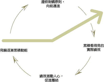 「從優秀到卓越」的公司了解一個簡單的事實:持續的改善和提升績效中蘊藏了巨大的力量。只要指出實際的成就——儘管最初還在逐步累積的階段,然後說明這些步驟如何呼應具體可行的經營理念。當你這麼做的時候,其他人逐漸了解並察覺公司正在加速向前衝,他們因此也會團結一致,熱情支持。我們稱之為飛輪效應,飛輪效應不只會發生在外部投資人身上,也能凝聚內部員工。