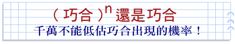 這類巧事,你一定聽到不少。對於那些看來極端不可能發生的事,我們總是賦予它神秘的色彩,認為背後一定有一股超自然的力量在操縱。其實,巧合就是巧合,不過是自然界機率定律的表現,只要機率不等於零,凡事都可能發生!這也是一種莫非定律(該來的總是會來)的展現。所以,千萬不能低估巧合出現的機率!