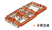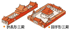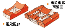 包括前殿、正殿及後殿。其中,有狹長如街屋者,如台南祀典武廟;或正殿獨立在中,呈「回」字形平面者,這是大型寺廟或孔廟才有的格局,如台北萬華龍山寺、台北保安宮。
