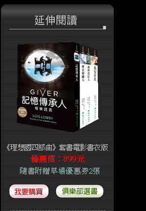 我特別欣賞勞瑞的是,她讓每一位青少年主角獨自去探索自己的天分,再勇敢的面對個人的人生挑戰。這些天分看似奇幻,其實都是重要的品格與才華。我覺得,她其實是在向每個年輕讀者暗示或明示,每個孩子都具有獨一無二的天分,只要你肯向內心探索,就可以找出你與眾不同的天分來改造世界。【理想國四部曲】的創作前後跨越了將近二十年,充滿了勞瑞奶奶的人生智慧與創意,影響了好幾個世代的小讀者與大讀者。這是一套可以從小讀到大的小說,在不同的年紀拿出來重讀,都會有不同的體會與領悟。 |