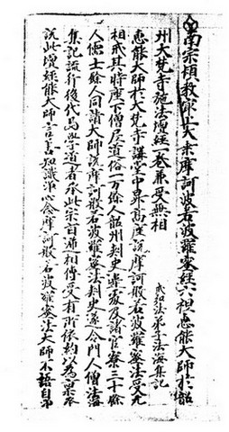(三)契嵩本:是北宋和尚契嵩在宋仁宗至和三年(一○五六)整理修訂過的本子。契嵩是北宋初年著名的佛學家,宋仁宗曾賜號「明教大師」。據說他曾據曹溪古本來參校,釐此書為三卷。題作《六祖大師法寶壇經曹溪原本》。
