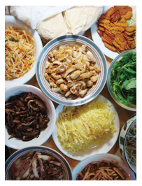 雖然我家潤餅的菜料隨著時間的推移有過不同的變化,不過,無論如何的變,有些菜色的處理手法在母親心中永遠不會改變。高麗菜切細條,芹菜切小段、筍子和紅蘿蔔切絲後,分別用蔥末乾炒,當然也少不了清炒的豆芽菜。除了這些青蔬外,還有數十年如一日的嫩煎豆腐條與蛋皮絲。