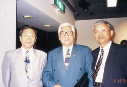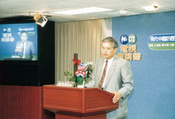 於《陸鏗回憶與懺悔錄》新書發表會會場,左起:矢吹晉、陸鏗、戴國煇,1997年7月12日