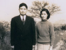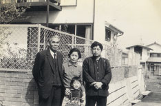台灣文學作家吳濁流(左)訪日來宅小住,戴國煇夫婦及次男戴興寧)與其合影,攝於日本千葉西習志野宅前,1971年4月