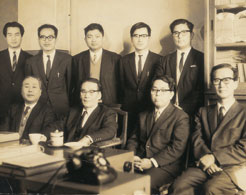 與東大教授合影,前排左起:古島敏雄教授、神谷慶治教授、加藤讓教授、伊東章講師;後排左一山本三郎,左三起:戴國煇、川本彰、藤島,約1965年