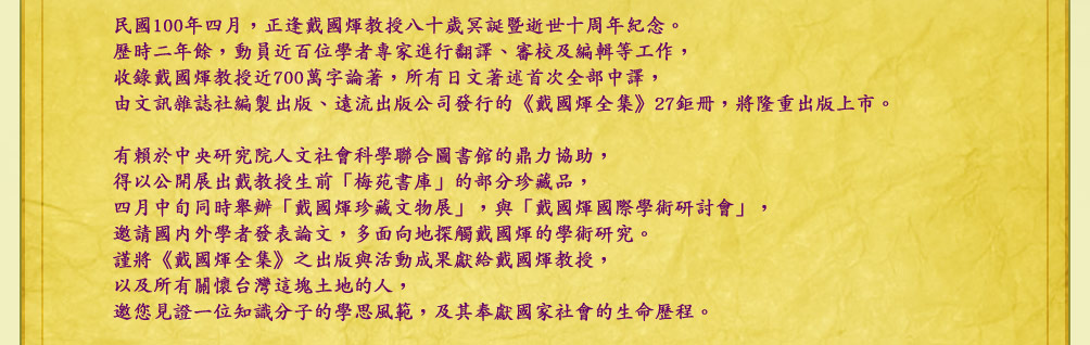 戴國煇1955年留學日本,曾列黑名單,有家歸不得,卻始終心繫故鄉台灣,畢生致力於台灣史研究,傾三十餘年心血投入二二八史料蒐集與研究,並以華僑史、近現代中日關係史研究專家著稱,一生著述甚豐。他不只是一位台灣近現代史研究者,也是一位台灣近現代史的參與者和見證人,更是遠近皆羨的台灣史史料收藏家。