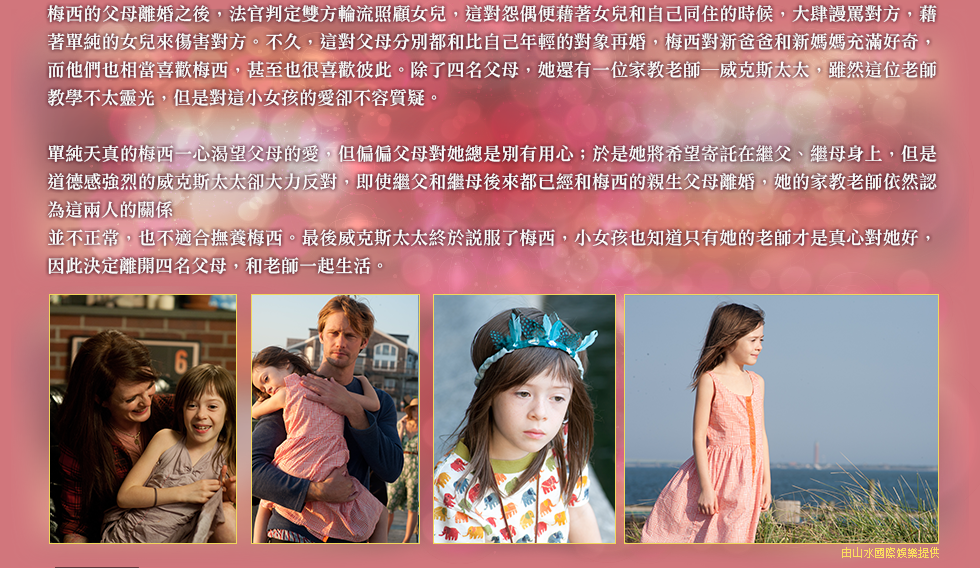 這句話,讓梅西莫名地承受了遠遠超出她理解範圍的愛與苦痛。所以梅西學到了裝聾作啞,在情緒上截斷,來明哲保身,換取空間,想讓自己成為觀眾,而非演員。然而,梅西滿載的情緒,最後還是讓她粉墨登場,扮演早熟的女主角,跟繼父間形成了非常複雜獨特的關係,也展開了戀父情結下的競爭腳本。她試圖藉由關係,卸下與釐清,那些不該是她這個年紀處理,也處理不來的千絲萬縷。