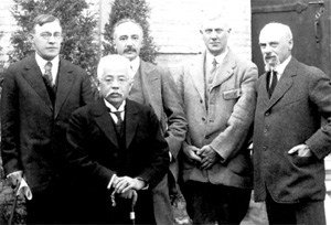 莫理循(後右二)任袁世凱的政治顧問時,與有賀長雄(前)、韋羅貝(後左一)等外籍顧問合影。 |