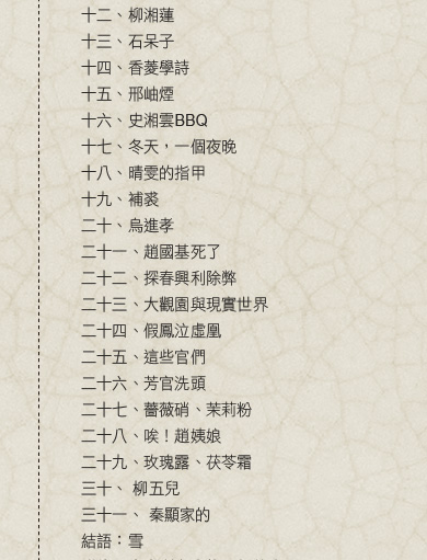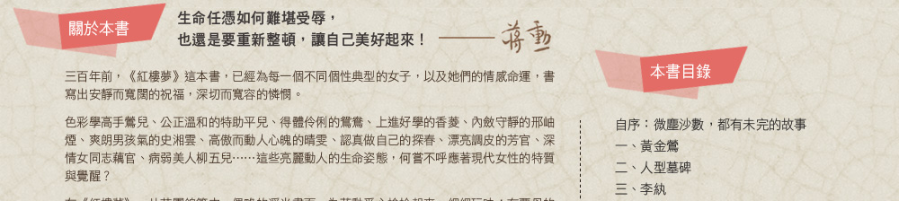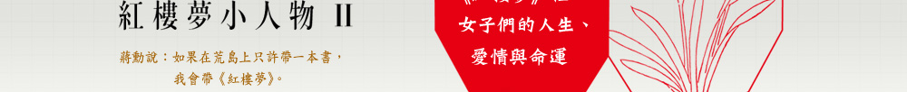 在第二輯的《紅樓夢小人物》裡,談了好幾位丫頭。有我最尊敬的公正寬容的平兒;有我最心疼的天真單純的金釧;有我剛開始不容易十分了解,後來越讀越覺得動人心魂的晴雯;有大方氣派、嚴詞拒絕好色老爺糾纏霸佔的鴛鴦;有從唱戲轉為丫頭的藕官,她(他)在舞台上一直演男角,愛上戲台上的女性角色,假戲真做,回不到現實,仍然追求愛戀著女子,她是《紅樓夢》裡深情的「女同志」;還有漂亮調皮的芳官,像個小男孩,寶玉也喜歡讓她男裝打扮;還有廚娘的女兒柳五兒,丫頭還沒做成,卻捲進竊盜官司裡,身體病弱,令人同情悲憫。