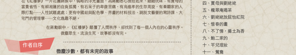 心裡惦記著《紅樓夢》裡多如繁星微塵般的眾生,像恆河沙數,無量、無邊、無盡,潮來潮去,翻滾浮沉,一個浪花,一個漩渦,就消逝得無蹤無影。有一天忽然想到一個微不足道的小人物──趙國基,就隨意問了幾個愛讀《紅樓夢》的朋友:「記得趙國基嗎?」