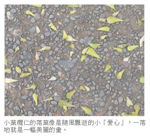 今年的春天來得早,清晨聽著雨聲起床,出門後發現陽光早把水氣蒸透,庭院中的杜鵑花早在二月底開始綻放,我想春神不會只鍾情於這一小片園圃。春光的召喚,在我心中勾勒出一片綺想。荳荳小時候,我們也曾經帶著她去台大校園閒逛。同樣是二月底的春日,滿地的小葉欖仁落葉,像是一張張愛心造型的書籤,靜悄悄地散落在教室外的長廊、路邊溝渠、柏油路面,還有我們的頭頂與肩膀上。荳荳蒐集了滿地的樹葉名片,再一股腦地撒在爸比頭上,我仍然記得她發出那悅耳的咯咯笑聲。