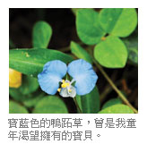 舟山路後方的農場是孩子們最愛的祕密花園,香草園是荳荳常來寫生的地方,裡面種著各種各樣的香草植物,週末的時候還有義工老師帶領導覽,有一陣子我的花台上種滿了薄荷、巴西里、薰衣草等香草植物,就是受此薰陶影響。園子後方還有一大片草地,附近種了一些麥粱類的農作物,這裡又稱「作物標本園」,我最喜歡帶孩子到附近的荒地上玩,望著長柄菊、咸豐草、鴨跖草……匍匐蔓延了整片綠野。小時候第一次見到鴨跖 草的情景,到現在我都還歷歷在目,因為很少看到藍色小花的我,立刻非常著迷,我還記得它躲在田埂附近一個小角落,我個子小採不到,只好央求哥哥幫忙,後來他就會以「我知道還有一種很漂亮的小花,如果妳不……我就不幫妳採。」為由,要我乖乖聽從他的指揮。比較起現在孩子以電視卡通或是電動玩具作為交換的籌碼,當年田地上的鴨跖草雖然不起眼,卻分外顯出孩子的純真可愛。或許從另一個角度來看,沒有這些小花的童年,又是如何的寂寞與無趣。