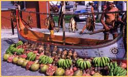達悟人以生活中的三大主食:小米、芋頭、地瓜,以及飛魚乾,擺放在拼板舟旁,作為主要的祭品。