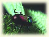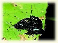 3. 看求偶交配行為 在野外觀察金花蟲,求偶交配的生態也是一個有趣的重點。以中、低海拔山路小徑旁常見的「藍金花蟲」為例,牠們常有成群密集啃食火炭母草的情形,因此火炭母草的葉片上很容易見到成雙成對正在交配中的藍金花蟲。