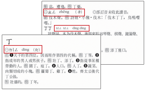 各字均依教育部「重編國語辭典」及「國語一字多音審訂表」為準據。每字先注「國語注音」符號,然後依次為「漢語拼音」符號及「直音」注音。國語有讀音、語音及今音、古音之別,若讀音不同,則「常用音」列前,「次用音」列後,釋義隨音附列,以符號一、二、三區分之。若為教育部「一字多音審訂表」未收之讀音,仍予以保留並加註「部訂音未收此讀音」。每一詞目則均並列「國語注音」、「漢語拼音」。 |