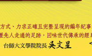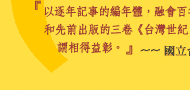 《認識台灣—回味1895-2000》打破傳統年表的純文字表格,以詳實扼要的文字加上珍貴精采的圖片,逐年呈現1895至2000年的台灣大事紀,包括改朝換代的政治大變動、糖米紡織電子資訊的產業大躍動,及生活文化的變貌,藉由年度焦點、人物特寫、風雲人物、流行花絮、重大施政、台灣第一、年度新鮮事等生動的紀事提要,讓歷史的脈絡深入淺出,在理解史事意義的同時,也能滿足您對生活與文化背景的探尋,是師生最佳的歷史課外參考書,也是每一個愛台灣的朋友最好的珍藏。 |
