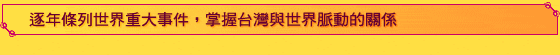 從1895年到2000年,一年一跨頁,全盤掌握台灣現代歷史進程中每年發生的大事,包括改朝換代的政治大變動,糖米紡織電子資訊的產業大躍進,及食衣住行育樂等生活、文化的變貌。同時在頁面下段呈現世界動態年表,編列政、經、戰爭、科技、文化等方面的國際要聞,以及經典郵票、圖像,讓讀者同步瀏覽台灣與世界的脈動,是一部清晰生動的中外對照20世紀台灣年錄。