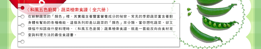 綠蔬菜續集,包含各種豆類、綠花椰菜、青椒等,以春到初夏的季節蔬菜為主,集合常見的綠色蔬菜。富含水分的蔬菜食譜,令人期待!