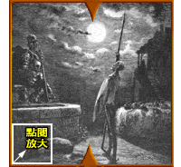 他在為《堂吉訶德》配畫時,曾親自到西班牙實地探訪,所以作品裡獨特的人物造型、壯觀的背景設計,能和西班牙實際風土人情完美融合,相得益彰。杜雷所領導的創作團隊在十九世紀後半期幾乎左右了整個插圖版畫工業。在他五十一年的短暫生命中,總共製作出四百多種版本、十萬餘幅金屬版和木版插畫。如同夢幻般的壯觀場景是杜雷版畫中典型的特徵之一,而這項特點對後世的版畫製作與二十世紀電影工業影響極為深遠。 |