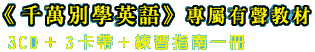 本教材為配合《千萬別學英語》一書所提倡的自然英語學習法而特別錄製,全套共3CD(聽力教材)、3卡帶(聽寫教材),一本練習指南,適合各年齡層、下定決心學好英語的人。本套英語會話教材為日常生活中真實情境的對話,由常用的單字及句子編纂而成,旨在訓練聽力、熟悉語言。《千萬別學英語》聽力與聽寫練習教材將打通你的耳朵,熟練發音,進而朗朗上口,完全掌握英文。