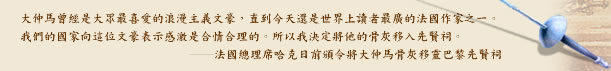 「法國萬神殿」是十八世紀教堂,位於賽納河畔左岸,法國大革命後,這座教堂即已成為奉祀國家英雄的廟堂,大仲馬是葬於「萬神殿」的第六位法國作家,其他文豪作家包含雨果、左拉、伏爾泰等人。
