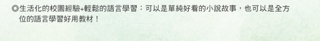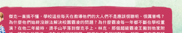 【我是傑克】不僅是教導小孩如何找到解決問題的方法,更是學習語言的好故事書。作者簡潔的語言與故事間的精采轉折,都是本書成功的地方。遠流出版,保留其英文原文,是個非常聰明的作法。我們可以閱讀中文,了解故事情節,也可以回頭看英文,品味這些簡潔語言帶來的美感與魅力。例如"I tried to smile and nod at him, but I know I looked kind of spooked, because I was spooked. And Link could see I was spooked. And he liked it. And that's when I knew I was in big bully-trouble." 短短四句,重複spooked,一方面交待傑克成為霸凌對象的過程,一方面也點出其內心的驚慌。這種精彩句子到處可見,值得細讀。
