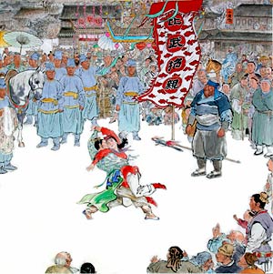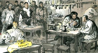 可是在他後面有八條大漢,面部不掛一絲表情,因為遠離光源,個個面部都是灰暗暗的,襯托出嚴寒的殺氣。還有一位已按著腰間掛刀,準備戰鬥。這是光與暗的、柔與剛的、愛與恨的強烈對比!