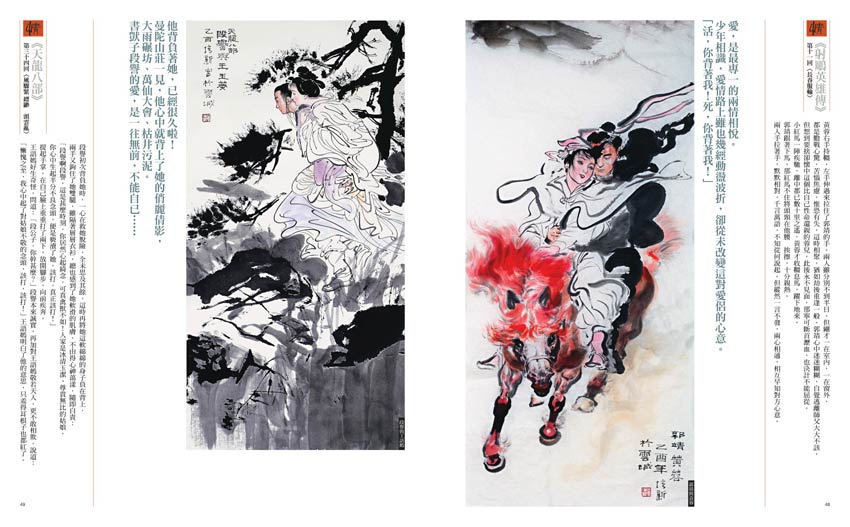 坊間有關金庸小說的繪畫創作,幾乎都以人物為主,而「以情節的動感來表現人物性格,體現故事張力」,董培新絕對為第一人。他以其最擅長的水墨人物畫,精準掌握金庸人物的型態與動作,並以「故事情節」為作畫底調,讓場面充滿動態感和立體感,不但牢牢抓住了小說內容的神髓,更表現出每個人物的性格特色,筆觸細膩,情感洋溢,一幅畫訴說了多樣風情,一筆一墨都值得細細品味。